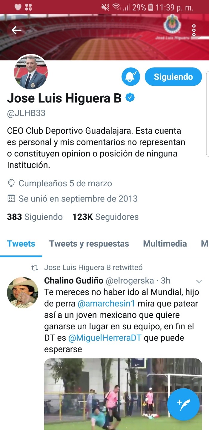 El pasado martes, dio mucho de qué hablar la jugada del arquero titular del América Agustín Marchesín sobre el canterano Arturo Sánchez, pues tras darle una patada desató todo tipo de comentarios en contra del cancerbero.La actitud de un consagrado como Marchesín fue pésima, por eso, aficionados del América y hasta los que no son afines al equipo le reclamaron al portero en redes sociales su actuar, al tiempo que también le solicitaban a la dirigencia un castigo ejemplar.Con el calor de los reclamos, apareció el director general del Guadalajara José Luis Higuera, dando un RT a un comentario en Twitter, en el cual se tachaba la acción del arquero americanista utilizando palabras altisonantes.Higuera ha mencionado en muchas ocasiones que su cuenta de Twitter es personal, que nada tiene que ver con el puesto que desempeña o la institución a la que representa, pero es claro que su imagen en un problema que no es de él, se daña más al participar porque avala un comentario que no está a la altura de un directivo de alto rango, como es su caso.OF