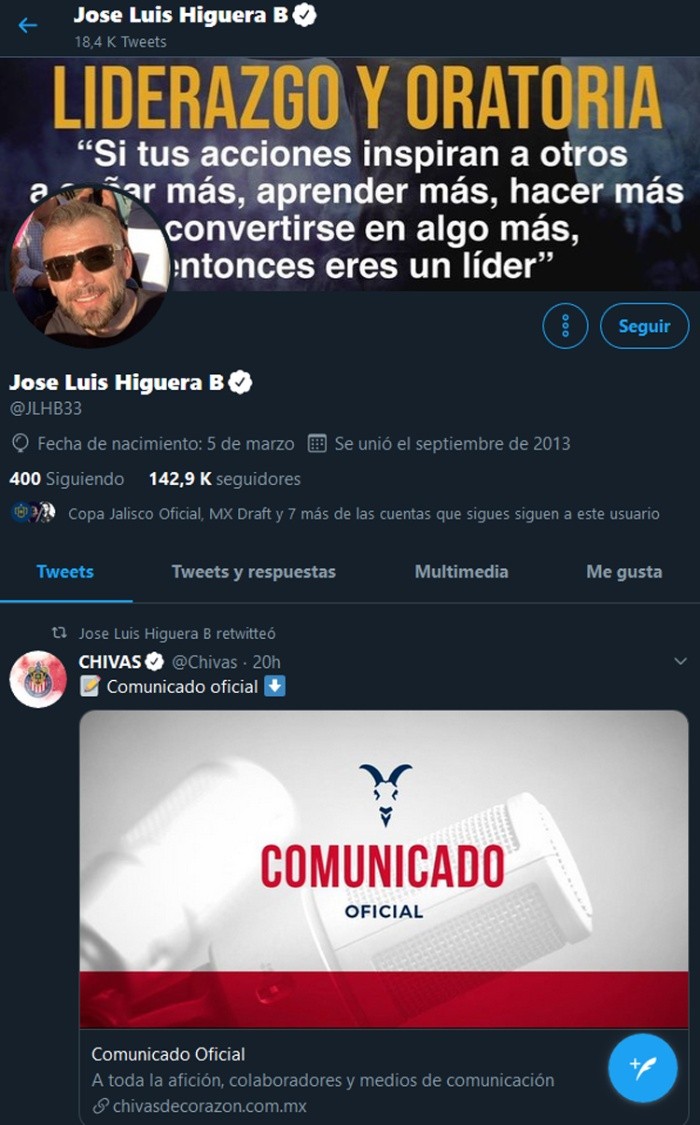 La última publicación en su amado Twitter de José Luis Higuera ligado al club Guadalajara fue la de su salida de la institución. Horas después, modificó todo lo que en su perfil tenía que ver con las Chivas.Antes del anuncio de la primera gran decisión de Amaury Vergara como el nuevo presidente del conjunto rojiblanco, el ahora ex directivo se ostentaba como el mandamás del chiverío."CEO del Club Deportivo Guadalajara. Esta cuenta es personal y mis comentarios no representan o constituyen opinión o posición de ninguna Institución", se podía leer en su biografía del Twitter.Ya después de la sacudida y el cambio en el organigrama, en la página de presentación de Higuera desapareció todo vínculo con el club.OF