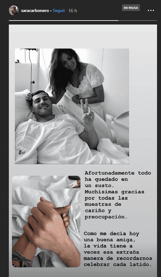 La esposa de Iker Casillas, Sara Carbonero, regresó hoy al hospital en el que el portero español se encuentra ingresado tras sufrir un infarto, el CUF de Oporto, para acompañarle a la espera de que el jugador sea evaluado nuevamente por los médicos.Carbonero acudió a la clínica a primera hora en un todoterreno y no hizo declaraciones a los numerosos medios españoles y portugueses que allí se congregan para conocer cómo evoluciona el guardameta.La periodista ya había mostrado en redes sociales el buen aspecto que al final de este miércoles presentaba Casillas, que fue sometido a un cateterismo apenas horas antes."Afortunadamente todo ha quedado en un susto", fue el mensaje de Carbonero en redes sociales, donde compartió una foto en la que se veía a ambos en el hospital y en la que agregó: "la vida tiene a veces esa extraña manera de recordarnos celebrar cada latido".El portero, que cumplirá 38 años este mes, comenzó a sentirse mal durante el entrenamiento del Oporto este miércoles por la mañana y fue trasladado del urgencia al hospital.La noticia pilló a Carbonero en Tarifa, sur de España, donde se encontraba trabajando, y regresó de inmediato a Portugal.