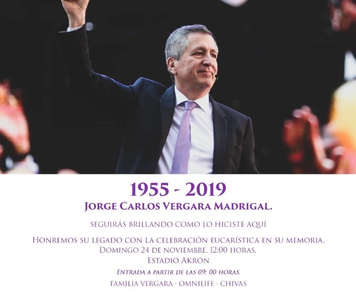 El sensible fallecimiento de Jorge Carlos Vergara Madrigal a los 64 años de edad en Nueva York, sigue dando de qué hablar. Quien fuera el propietario del Club Deportivo Guadalajara será motivo de homenajes en la que alguna vez fue su casa, la cual construyó con su esfuerzo, su dinero y sus ilusiones.El próximo domingo 24 de noviembre se llevará a cabo una misa solemne en memoria del empresario tapatío, la cual tendrá lugar en el Estadio Akron en punto de las 12:00 horas, con acceso a la afición de manera libre, en donde la entrada será a partir de las 9:00 horas al recinto futbolero, que en esa ocasión vivirá momentos de nostalgia, tristeza y de emociones encontradas.“Seguirás brillando como lo hiciste aquí. Honremos su legado con la celebración eucarística en su memoria”, invitó así la familia Vergara, así como el Grupo Omnilife Chivas a toda la afición y comunidad futbolística en Guadalajara y México.Los homenajes a Vergara Madrigal comenzaron desde el viernes en el partido de Ida de los Cuartos de Final entre Chivas y América Femenil en el propio Estadio Akron, con un minuto de silencio, el cual se convirtió en un minuto de aplausos, así como la proyección de un emotivo video en las pantallas del recinto rojiblanco.Se espera que el próximo sábado, previo al encuentro entre Chivas y Veracruz en el inmueble del Periférico se lleven a cabo más homenajes en memoria de Jorge Carlos Vergara, sin embargo, será durante la semana cuando se detallen los eventos que se realizarán en memoria del empresario de productos alimenticios y uno de los hombres más importantes del futbol mexicano en la era contemporánea.Las muestras de cariño hacia el empresario y la familia Vergara continuaron ayer a un día de su fallecimiento. El staff que labora en el Club Guadalajara publicó en la cuenta oficial de Chivas: “Porque nos enseñaste a vivir sin miedos y prejuicios y con ejemplo convertiste los obstáculos en retos siempre hablando de frente. Porque supiste mostrarle al país entero que con once mexicanos era suficiente, por eso te diremos, maestro y amigo, gracias Jorge”.