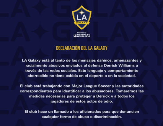 Después de que una barrida suya pusiera en riesgo la carrera de Andy Polo, Derrick Williams, defensa del LA Galaxy, ha recibido mensajes raciales a través de las redes sociales.Hace unos días, durante el partido entre los californianos ante los Timbers, el irlandés se barrió sobre el peruano, quien sufrió una rotura del cuádriceps y un menisco en la pierna izquierda.El club angelino salió en defensa de su jugador, ya que ha sido amenazado por esa brutal entrada."El Galaxy está al tanto de los mensajes dañinos, amenazantes y racialmente abusivos enviados al defensa Derrick Williams a través de las redes sociales. Este lenguaje y comportamiento aborrecible no tiene cabida en el deporte o en la sociedad", comunicó el equipo."El club está trabajando con Major League Soccer y las autoridades correspondientes para identificar a los abusadores. Tomaremos las medidas necesarias para proteger a Derrick y a todos nuestros jugadores de estos actos de odio".Polo se perderá el resto de la temporada. AJ