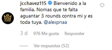 Nicole Chávez, la hija menor de Julio César Chávez se la puso difícil a su novio.La joven subió a redes sociales un video con su novio y todos la felicitaron.En la sección de comentarios apareció el Gran Campeón Mexicano con un mensaje directo: "Bienvenido a la familia. Nomás que te falta aguantar tres rounds contra mí y es toda tuya".No ha habido respuesta del novio o de la hija del Gran "JC".OF