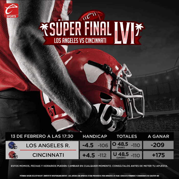 La hora de la verdad llegó entre Cincinnati y Los Ángeles este domingo 13 de febrero en punto de las 17:30 horas en el SoFi Stadium, el joven sensación del futbol americano Joe Burrow se enfrenta al resiliente, Matthew Stafford, ambos competirán por su primer campeonato. La casa de apuestas más grande de México tiene a Los Ángeles como favoritos para ganar este domingo, los angelinos tienen un momio de -200, es decir, si tú apuestas tus $400, ¡cobrarías $600!Ahora, se viene un súper momio para el menos favorito, Cincinnati paga $1,080 por cada $400 apostados, es decir, tiene un momio de +170. Uno de los mercados favoritos de los apostadores es el Total de Puntos, pero dadas las circunstancias del partido, se supone que habrá menos de 48.5 puntos y este tiene un momio de -110, por lo que, si le metes tus $400 a este resultado, ¡ganarías $763! Caliente.mx tiene más de 600 mercados para apostar al domingo más importante del año en el futbol americano y aquí te dejamos las apuestas divertidas para este magno evento.Como parte de las apuestas más raras del futbol americano, están las que son sobre el medio tiempo en el cual, Snoop Dog se presentará junto a Dr. Dre, Mary J.Blige, Kendrick Lamar y Eminem, donde podría pasar de todo y viene la pregunta más popular en los últimos días: ¿Cuánto ganarías si Snoop Dog fuma en el medio tiempo? Si el famoso rapero fuma durante el show de medio tiempo, ¡cobrarías $620 por cada $400 apostados! Es decir, tiene un momio de -182. Si no tienes cuenta en Caliente.mx, hazlo ahora y recibe $400 de regalo para apostar a la Final del Súper Domingo de Futbol Americano.