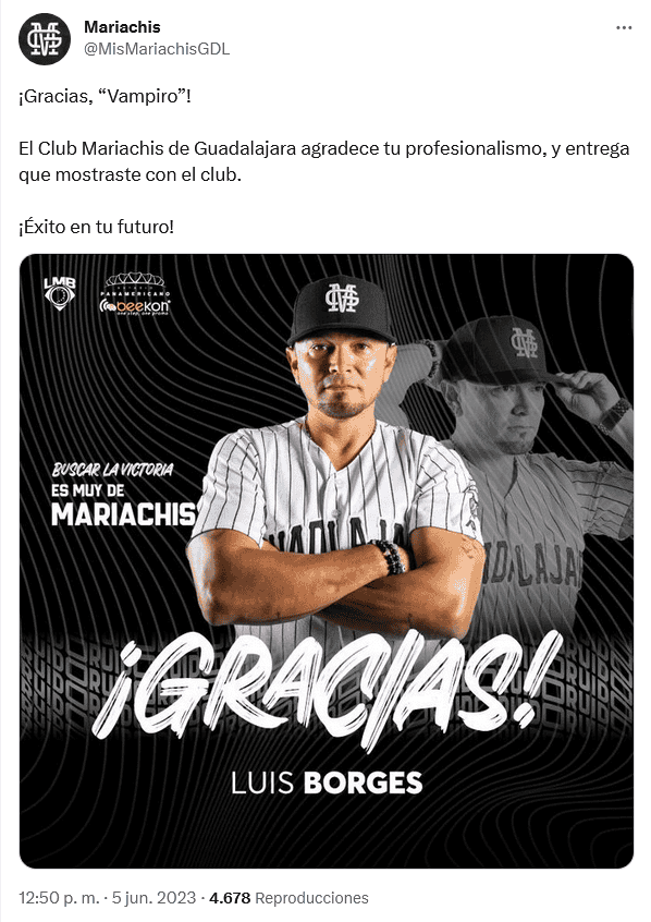 Ante el mal paso del equipo, los Mariachis de Guadalajara han tomado la decisión de cesar a Luis Borges como su manager.El novel manejador tomó a la escuadra tapatía para vivir su primera experiencia en la caseta, sin embargo, sus números no respaldaron su proyecto y este lunes la directiva le dio las gracias por estos meses de trabajo."Gracias, ‘Vampiro’. El Club Mariachis de Guadalajara agradece tu profesionalismo y entrega que mostraste con el club. Éxito en tu futuro", reza el mensaje que el equipo tapatío publicó en sus redes sociales para anunciar el despido de su entrenador. Esta decisión de los Mariachis se tomó después de que el equipo sumara su séptimo descalabro de manera consecutiva y se confirmara como le peor equipo de la Zona Norte de la Liga Mexicana de Beisbol (LMB).Ahora mismo los Mariachis tienen un récord negativo de 14 victorias por 25 descalabros, situación que mantiene al equipo en el fondo del standing de su Zona y como una de las peores escuadras del circuito veraniego en general.Fue el pasado 21 de abril cuando los Mariachis debutaron en esta campaña de la Liga Mexicana de Beisbol (LMB), y a menos de dos meses de distancia todo parece indicar que por segunda campaña consecutiva se quedarán lejos de los primeros planos de la pelota nacional.Con la salida del "Vampiro" Mariachis ya suma tres managers en mismo número de temporadas, pues antes de Borges también se dio la salida de Benjamín Gil y de Sergio Omar Gastélum.OF