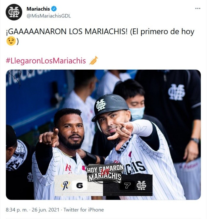 Los Mariachis de Guadalajara siguen sin desentonar dentro de la Liga Mexicana de Beisbol (LMB), pues este día derrotaron a los Rieleros de Aguascalientes en el primer juego de la doble cartelera que fue programada para este sábado dentro del Estadio Panamericano.Fue al son de 6-7 que la novena tapatía se impuso a la visita, esto después de que el primer juego de la serie no pudiera realizarse el viernes pasado debido a la lluvia que cayó sobre Zapopan.Para este duelo Mariachis tuvo que remar contracorriente, pues de manera sorpresiva los Rieleros comenzaron arriba en la pizarra al lograr cuatro carreras entre la primera y la tercera entrada.Por fortuna para los comandados por el mánager Benjamín Gil, Mariachis consiguió un rally de cinco carreras al cierre del primer tercio y nunca volvió a verse en desventaja durante el resto del encuentro.Al ser doble cartelera, este juego se disputó sólo hasta la séptima entrada, y ahora Mariachis tratará de amarrar la serie con un segundo triunfo ante la novena hidrocálida.JM
