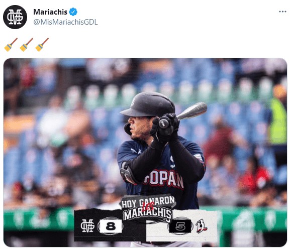 El triunfo se lo llevó Marco Carrillo de Mariachis con labor de cinco entradas, admitiendo una carrera, cinco hits, cuatro bases por bola y dos ponches. TWITTER / @MisMariachisGDL