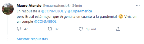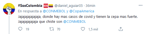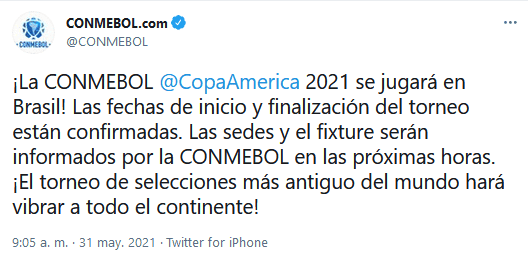 Después de que la tarde de ayer domingo 30 de mayo se diera a conocer que Argentina no organizaría la Copa América en su edición 2021 debido al aumento de casos de COVID-19, la Conmebol anunció esta mañana que la nueva sede será Brasil.A través de un mensaje en sus redes sociales la Confederación informó:"¡Brasil recibirá a la CONMEBOL Copa América 2021! El mejor fútbol del mundo llevará alegría y pasión a millones de sudamericanos. La CONMEBOL agradece al Presidente Jair Bolsonaro y su equipo, así como a la Confederación Brasileña de Fútbol por abrir las puertas de ese país al que es hoy en día el evento deportivo más seguro del mundo. ¡Sudamérica brillará en Brasil con todas sus estrellas!"El mensaje recibió varias criticas por la nueva sede, debido a que Brasil es uno de los países con más casos y muertes por el COVID-19.La máxima autoridad del fútbol sudamericano indicó en un escueto comunicado que las "fechas e inicio del torneo están confirmadas" y que las "sedes y el 'fixture' serán informados en las próximas horas".La Conmebol lo anunció después de que Argentina fuera descartada como sede del torneo que iba a compartir con Colombia, que solicitó un aplazamiento ante el conflicto social en ese país, lo que no fue aceptado por ese organismo.Con información de EFE