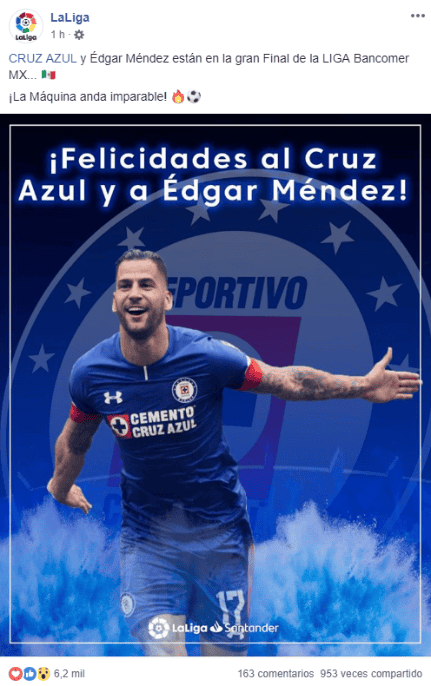 Cruz Azul regresó a una final de liga después de cinco años. La última ocasión fue en el Clausura 2013 ante el América, donde perdieron de forma dramática.Hoy el futbol lo pone en otra serie por el título y esa noticia cruzó fronteras. Las felicitaciones a la Máquina llegaron desde España.La Liga felicitó a Cruz Azul y al español Edgar Méndez por estar en la final del futbol mexicano. "La Máquina anda imparable", fue la frase que acompañó la publicación con una foto de Méndez, ex jugador del Alavés.Lo curioso de la publicación es que La Liga mencionó una cuenta no oficial de Cruz Azul.GC