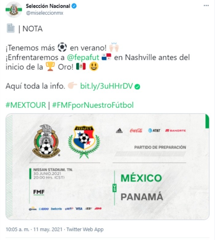 La Selección Mexicana de futbol se medirá el 30 de junio a la de Panamá en un partido amistoso en Nashville (Tennessee, EU), previo a su participación en la Copa de Oro de la Concacaf, en la que defenderá el título a partir del 10 de julio.La Federación Mexicana de Futbol confirmó este martes la disputa del partido que dará continuación al trabajo del seleccionador, el argentino Gerardo Martino, para los principales compromisos de la temporada.México se enfrentará a Islandia el 29 de mayo, en Arlington; y a Honduras, el 12 de junio en Atlanta, en dos partidos, asimismo en Estados Unidos, previos al enfrentamiento ante los panameños, con los que suman 14 victorias, dos derrotas y cinco empates.Este año, México tiene como sus compromisos principales la parte decisiva de la Liga de las Naciones, en la que se enfrentará a Costa Rica el 4 de junio en las semifinales; la Copa Oro y el inicio de las eliminatorias para el Mundial de Qatar.Para la Liga de las Naciones, Martino convocó a casi todos sus jugadores excepto al delantero Javier Hernández, del Galaxy de la MLS, quien va de líder goleador en la liga de Estados Unidos y se espera que en ese certamen y en los dos siguientes el equipo participe con una mezcla de veteranos de buena trayectoria con jóvenes talentosos.Aunque asumirá con seriedad los torneos del año, Martino tiene como prioridad en el 2021 los Juegos Olímpicos de Tokio, en los que el seleccionador sub'23, Jaime Lozano, tendrá la posibilidad de convocar a Diego Lainez, del Real Betis, Edson Álvarez, del Ajax holandés y Gerardo Arteaga, del Genk belga, además de algunos futbolistas mayores de 23 años.México, campeón olímpico en Londres 2012, perdió en primera ronda en los Juegos de Río de Janeiro 2016 y ahora se propone luchar de nuevo por medalla en Tokio.En los Juegos Olímpicos los mexicanos jugarán en el grupo A, contra Japón, Francia y Sudáfrica. OF