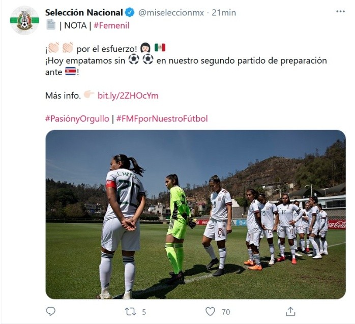 En juego celebrado este martes a puerta cerrada en el Centro de Alto Rendimiento de la Federación Mexicana de Futbol, la Selección Nacional Femenil empató a cero goles con Costa Rica.El sábado pasado, en el primer encuentro entre estas dos selecciones, el marcador había sido de 3-1 a favor de las jugadoras aztecas.La entrenadora Mónica Vergara presentó a un equipo alternativo con respecto al del partido del sábado, pero aun así dominó la gran parte de éste, siendo la arquera tica la gran figura.Costa Rica, con base en contragolpes, quiso poner en peligro la meta defendida por Isabel González.La entrada en la segunda parte de jugadoras como Stephany Major le dio más poderío ofensivo al cuadro mexicano, pero no hubo suerte de marcar.Este fue el primer empate entre estos dos equipos. El récord queda con seis triunfos para México, dos derrotas y ahora una igualada.Después de los dos juegos celebrados ante Costa Rica, la entrenadora de la Selección Nacional femenil, Mónica Vergara, se dijo contenta y orgullosa de lo que mostró su equipo."Estoy contenta con todas las jugadoras que participaron. Es un conjunto de futbolistas increíbles. Este es un inicio de un proceso, hace falta trabajo, pero estoy contenta con el compromiso que pusieron, porque lo que se entrenó trataron de implementarlo en la cancha", declaró .Lo que sigue es "crear un estilo de juego. Lograron plasmar lo que se trabajó en estos días, repito. Tenemos que seguir trabajando para ser más agresivas en la parte ofensiva, pero es algo que logras con más entrenamiento. Ahora seguiremos yendo a los partidos para ver cómo evolucionan las chicas".JM