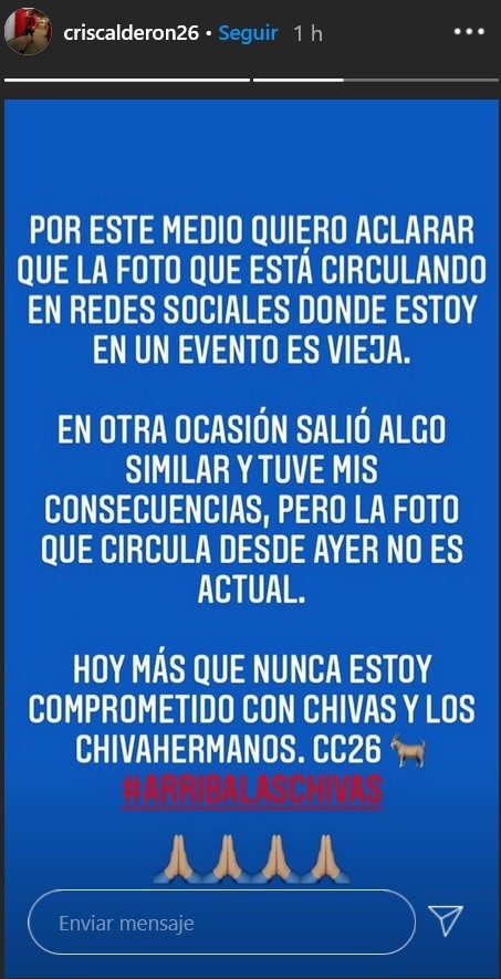 Después de que saliera a la luz una fotografía en donde se le observa conviviendo y cantando en una fiesta, Cristian “Chicote” Calderón, defensa lateral del Guadalajara, aseguró que a diferencia de lo que se ha dicho en redes sociales, esa fotografía no corresponde al fin de semana pasado.Fue a través de su cuenta de Instagram que el zaguero rojiblanco salió en su defensa al asegurar que no rompió con las medidas sanitarias impuestas debido al COVID-19.“Por este medio quiero aclarar que la foto que está circulando en redes sociales, donde estoy en un evento, es vieja. En otra ocasión salió algo similar y tuve mis consecuencias, pero la foto que circula desde ayer no es actual. Hoy más que nunca estoy comprometido con Chivas y los chivahermanos”, escribió el defensor.Anteriormente Calderón ya se había visto involucrado en una situación similar, y esto provocó que la directiva rojiblanca lo relegara del primer equipo durante una jornada del Clausura 2020.JM