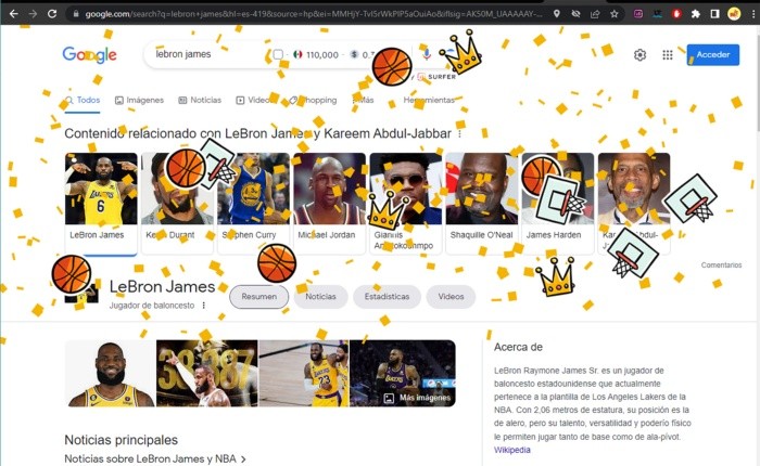 LeBron James, jugador de Los Angeles Lakers, hizo historia la noche del 7 de febrero al romper el récord de anotaciones de la NBA, tras superar los 37 mil 387 puntos que hasta entonces ostentaba la leyenda Kareem Abdul-Jabbar, quien se retiró a finales de los años 80.Ante la marca histórica alcanzada en la Crypto Arena de Los Angeles Lakers, Google premió con un bonito detalle al ahora líder anotador, y lo puedes vivir de esta manera.En tu celular o computadora, ingresa al buscador de Google y teclea el nombre, LeBron James o LeBron, y verás cómo desde la parte superior de la pantalla bajan canastas, balones de basquetbol y hasta coronas, que hacen honor del logro del "King".Anoche, LeBron James llegó a los 38 mil 390 puntos, y seguirá mientras siga en activo, para acrecentar su leyenda como uno de los mejores jugadores de todos los tiempos.OF