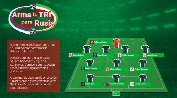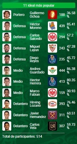 Para los lectores de EL INFORMADOR en internet, los jugadores mexicanos que se desempeñan en el extranjero deberían formar el plantel titular que enfrente los partidos del Mundial de Rusia 2018.Una encuesta en la que han participado hasta ahora 511 personas arroja como resultado un cuadro inicial compuesto exclusivamente por futbolistas que juegan fuera del país.La votación continúa abierta; es posible acceder a ella pulsando aquí o en el vínculo que se encuentra más abajo.Según nuestros lectores, la formación 4-3-3, la preferida por el seleccionador Juan Carlos Osorio, debería estar conformada por Ochoa en la portería; Salcedo, Reyes, Moreno y Layún en la defensa; Guardado, Herrera y Marco Fabián en el medio campo y Lozano, "Chicharito" y Vela en la delantera.Aunque también es posible elegir jugadores de la Liga MX, la formación elegida por nuestros lectores se asemeja al cuadro titular usual de Osorio, lo que hace pensar que el desacuerdo de la afición con el entrenador colombiano reside más en el sistema de rotaciones que en la elección de los jugadores.El futbolista que recibió más consensos fue Andrés Guardado, mediocampista tapatío del Betis. El 86.3 por ciento de las personas que votaron creen que el "Principito" debe estar en el once titular del Tri.El segundo jugador con más preferencias fue un defensa, Héctor Moreno, que actualmente juega para la Real Sociedad de España y obtuvo el 85.4 por ciento de los votos.Por el contrario, el futbolista que recibió menos votos fue el mediocampista del Eintracht Frankfurt Marco Fabián, con sólo el 30.92 por ciento de las preferencias.El otro jugador que despierta dudas en la afición es el portero Guillermo Ochoa, que recibió el 36.59 por ciento de los votos.Rafa Márquez, un referente de la Selección mexicana que podría disputar su quinta Copa del Mundo, no fue elegido por nuestros lectores como uno de los componentes del once inicial ideal del Tri.Todos los futbolistas seleccionados por nuestros lectores se desempeñan en ligas europeas, excepto Carlos Vela, que se unió este año al club Los Ángeles LA, de la MLS de Estados Unidos. RR