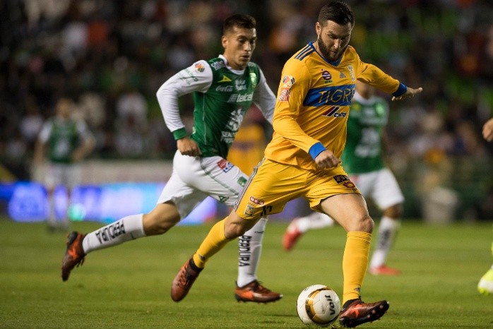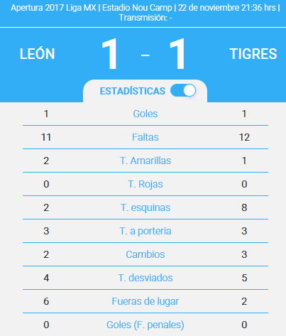 El León y los Tigres de la UANL empataron 1-1 en partido de ida de cuartos de final del torneo Apertura 2017 disputado en el estadio Nou Camp, casa de los Esmeraldas.Los goles fueron obra de Mauro Boselli (58') por León y Eduardo Vargas (75') por los Tigres.Tigres desplegó toda el poder de su arsenal ofensivo: los recortes de Aquino por la izquierda, la velocidad de Damm por la derecha y en el centro, la potencia física de Gignac y la imaginación incendiaria del chileno Eduardo Vargas.Menos potente al ataque, León generó peligro gracias a la visión y el toque de sus atacantes. Boselli tuvo un par de ocasiones que parecían promisorias, pero los pases lo encontraron en fuera de lugar. Los Esmeraldas tuvieron su mejor ocasión al minuto 42', cuando Elías Hernández asistió por izquierda a Navarro, que cedió de taco a Boselli, quien mandó el esférico fuera del campo.En la segunda parte, tigres y leones continuaron intercambiando zarpazos hasta que Mauro Boselli encontró el balón que estuvo esperando sin que llegara en toda la primera parte. En un contragolpe Ramos, que entró como cambio por Piris, asistió al goleador, que venció a Nahuel Guzmán con un tiro raso a segundo poste.El empate llegó por cortesía de otro jugador que no dejó de buscar el gol en la primera parte. Al 75, Dueñas pasó el balón a Vargas, que definió con un derechazo raso para poner el 1-1 en el marcador.La vuelta se jugará el próximo sábado 25 de noviembre a las 19:00 horas, en el estadio de la UANL.ALINEACIONESLEÓN: Yarbrough, Mosquera, González, Piris (Ramos, 75'), Navarro, Cornejo, Mejía, Rodríguez, Hernández, Andrade (Cerato 85'), Boselli (C). DT: Gustavo Díaz.TIGRES: Guzmán, Juninho, Ayala, Torres Nilo, Rodríguez, De Souza (Vázquez, 47'), Dueñas, Aquino, Damm (Sosa, 76'), Vargas, Gignac (Valencia, 81'). DT: Ricardo Ferretti.ÁRBITRO: Diego Montaño Robles.