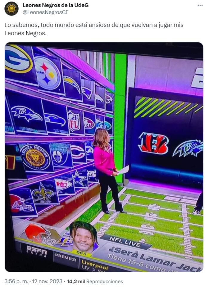Este fin de semana tuvo lugar la semana 10 de la NFL y en la cadena ESPN ocurrió un divertido momento relacionado con Leones Negros. Esto debido a que el equipo de la Universidad de Guadalajara apareció entre los diversos equipos de esta liga de futbol américano.Los Leones Negros fueron confundidos con los Leones de Detroit, pues el escudo de los de la UdeG reemplazó al del equipo de la NFL en uno de los programas de ESPN. Ante este error, las redes sociales se llenaron de bromas respecto a lo sucedido e incluso la cuenta oficial del equipo de futbol mexicano hizo mención de lo ocurrido. Los Leones Negros clasificaron recientemente a la Liguilla de la Liga de Expansión y jugará los cuartos de final contra el Club Atlético Morelia. La ida se realizará el 15 de noviembre y la vuelta el 18 del mismo mes.SV