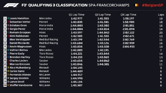 El británico Lewis Hamilton (Mercedes) logró este sábado la ''pole'' en el Gran Premio de Bélgica, su punta número 78 en Fórmula 1, al término de una sesión clasificatoria perturbada por la lluvia sobre el circuito de Spa-Francorchamps.El líder del Mundial de F1 estará el domingo acompañado en primera línea por su perseguidor en la clasificación general, el alemán Sebastian Vettel.Los Racing Point Force India del francés Esteban Ocon y del mexicano Sergio Pérez ocuparán la segunda línea.Al igual que ocurriese en Hungría antes de la pausa estival, Hamilton se vio beneficiado por la lluvia para superar a su rival por el título."La lluvia es mi amiga", bromeó el británico en conferencia de prensa.Esta es la quinta pole lograda en Bélgica por Hamilton, todo un récord en esa faceta."Fue una de las sesiones de clasificación más difíciles que recuerdo", declaró Hamilton.La lluvia hizo acto de presencia antes de la tercera y última parte de la sesión clasificatoria, cuando Ferrari parecía mostrarse más fuerte.La Scuderia no logra la pole en Spa-Francorchamps desde 2007, cuando se hizo con ella el finlandés Kimi Räikkönen.Los Red Bull del holandés Max Verstappen y del australiano Daniel Ricciardo sólo fueron séptimo y octavo.OF