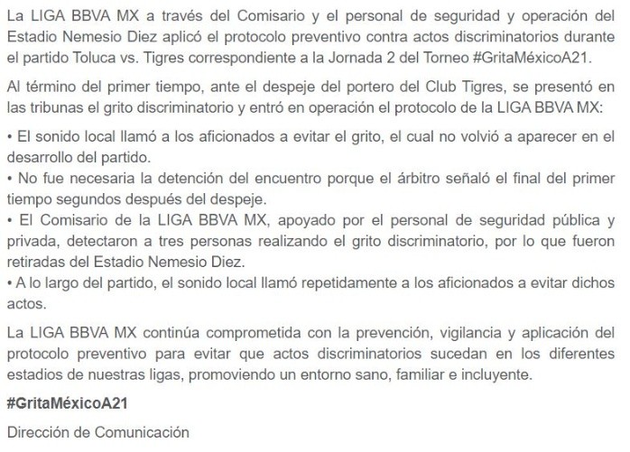Lamentablemente algunos aficionados en el futbol mexicano siguen sin entender que los gritos homofóbicos que hacen en contra de un portero cuando despeja un balón perjudican al espectáculo, como lo sucedió este medio día en el estadio Nemesio Díez en el partido entre Toluca vs Tigres.Es por eso que la Liga MX comienza a tomar medidas drásticas para que comience a erradicarse y que el público entienda que no es un chiste.A través de un comunicado, la liga informó que tres adicionados fueron retirados de 'La Bombonera' conforme al protocolo preventivo contra actos discriminatorios.Fue al término del primer tiempo cuando Nahuel Guzmán despejó un balón y en las gradas se realizó el grito discriminatoria, por lo que de inmediato el sonido local llamó a los aficionados para evitarlo.El Comisario de la Liga MX junto con miembros de seguridad pudieron detectar a tres sujetos realizando el grito, por lo que fueron retiradas del recinto. Si quieres tener más contenido, más imágenes y aún más noticias, entonces descarga INFORMAPlus, la aplicación digital de EL INFORMADOR, donde tenemos materiales exclusivos para tí.Descarga la aplicación y pruébala GRATIS por treinta días. Para iOS: https://apple.co/35jaVgbPara Android: https://bit.ly/3gwVSEVSi eres suscriptor de EL INFORMADOR tu acceso está incluido, solicítalo al 33 3678-7777JL