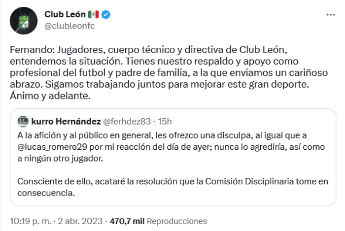 Luego de la polémica que sacudió a la Liga MX el pasado sábado, cuando el árbitro Fernando Hernández le dio una patada al jugador del León Lucas Romero, el silbante se pronunció la tarde de ayer domingo en sus redes sociales.En su cuenta de Twitter @ferhdez83, el árbitro ofreció disculpas a la afición y al público en general: "Les ofrezco una disculpa, al igual que a @lucas_romero29 por mi reacción del día de ayer; nunca lo agrediría, así como a ningún otro jugador", dijo.Además, señaló que: "Consciente de ello (su acción), acataré la resolución que la Comisión Disciplinaria tome en consecuencia".Por su parte, el equipo de León respondió, citando el tuit."Fernando: Jugadores, cuerpo técnico y directiva de Club León, entendemos la situación. Tienes nuestro respaldo y apoyo como profesional del futbol y padre de familia, a la que enviamos un cariñoso abrazo. Sigamos trabajando juntos para mejorar este gran deporte. Ánimo y adelante".Fue el sábado 1 de abril cuando León y América empataron 2-2 en el Estadio Azteca, en acciones de la Jornada 13 de la Liga MX. El partido estuvo salpicado de la polémica arbitral, ya que los reclamos por parte de los aficionados iban de jugadas sancionadas o ignorada, el pleito entre los entrenadores Nicolás Larcamón y Fernando "Tano" Ortiz, quienes terminaron expulsados, y la patada de Fernando Hernández a Lucas Romero.Después del primer gol del América, que parecía precedido de una mano que no fue revisada por el VAR, los jugadores de León se fueron sobre el árbitro y éste, se ve claramente en videos que circulan en redes sociales, le dio un rodillazo al argentino Lucas Romero.Luego de la queja de los jugadores y las acusaciones apoyadas por los videos, la Comisión de Arbitraje de la Federación Mexicana de Futbol (FMF) informó que el árbitro será investigado por lo sucedido en el Estadio Azteca."La Comisión de Árbitros informa que se abrirá un proceso de investigación sobre los hechos acontecidos", comunicó el órgano regulador.OF