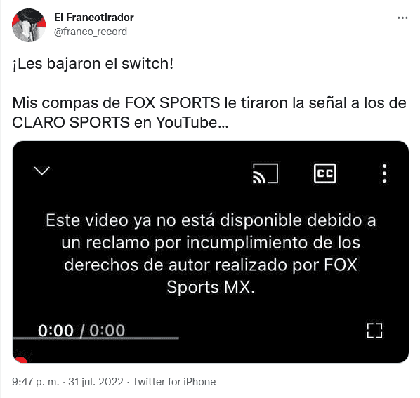 La noche del 31 de julio, miles de aficionados encontraron en la plataforma de Claro Sports la opción para ver en vivo el partido León vs América de la Liga MX, con el que se cerró la J6 del Torneo Apertura 2022.Fox Sports, otro de los propietarios de los derechos de transmisión de La Fiera decidió enviar el juego a su versión Premium, la cual cobra un costo extra de 130 pesos mensuales.Según dijeron en la transmisión de Claro Sports, más de medio millón de personas presenciaba el juego cuando, en YouTube, el video se detuvo y apareció la leyenda "este video ya no está disponible debido a un reclamo por incumplimiento de los derechos de autor realizado por Fox Sports MX".Aunque Claro Sports abrió un par de nuevas señales, Fox Sports logró tirarlas y de hecho no pudo verse por esa vía el penalti -anotado por Ángel Mena- con el que el León derrotó al América (3-2).Técnicamente no, porque ambas empresas pagaron para tener los derechos de transmisión de La Fiera.El problema es que Fox Sports demanda que no se puede hacer uso de la transmisión en plataformas digitales, ya que los cortes solo se dieron en esta versión. Las personas que tienen en su sistema de televisión de paga la señal de Claro Sports no tuvieron problema alguno para ver el juego.La postura de Fox Sports generó molestias entre los aficionados, quienes consideraron que no fue justo lo que sucedió. En redes sociales llovieron las quejas y por supuesto, también los memes.OF