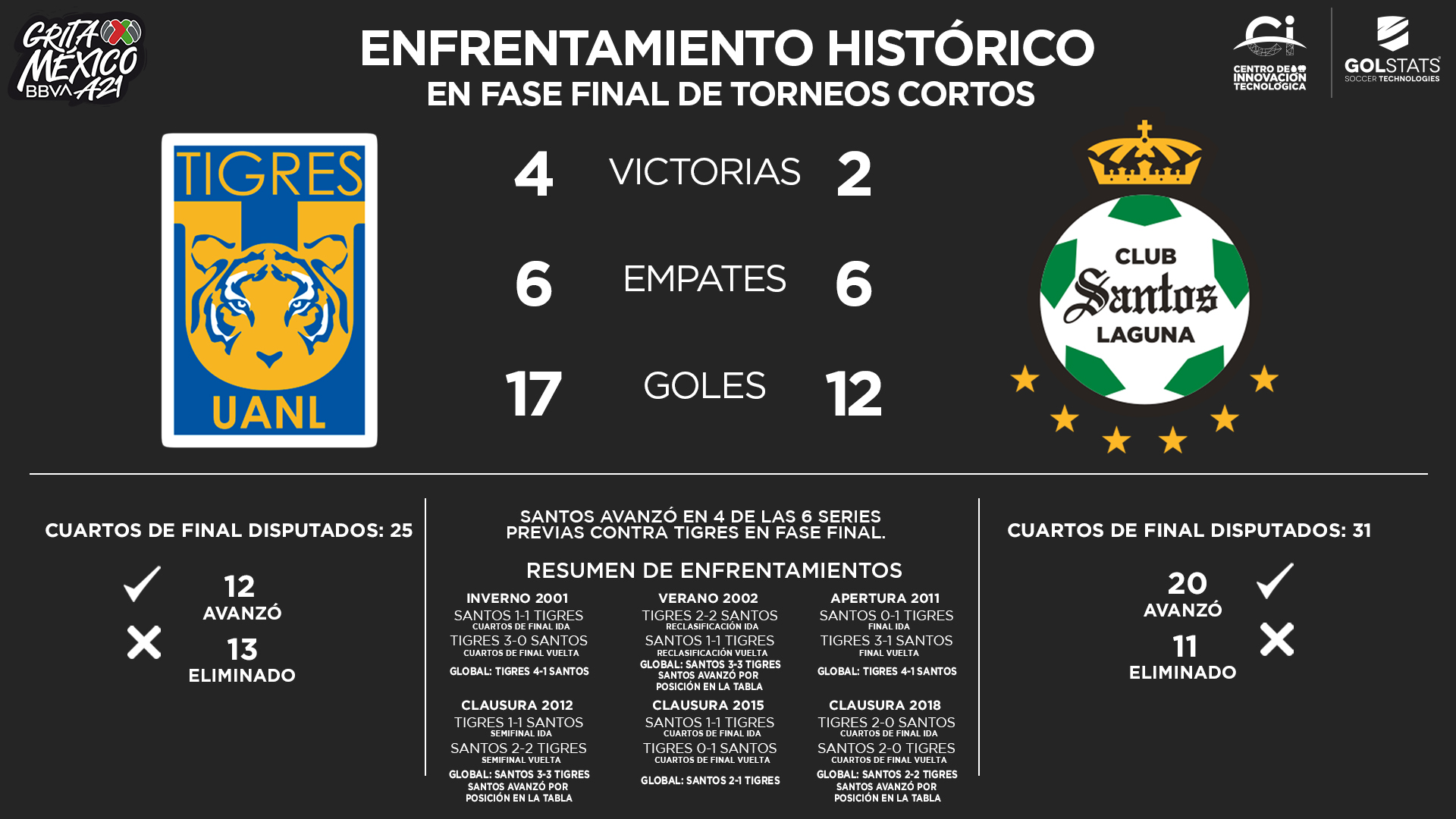 El duelo entre Santos y Tigres por los Cuartos de Final del Apertura 2021 han generado bastantes expectativas por el momento similar que atraviesan ambas escuadras. Además, los antecedentes que tienen en Liguilla, suman para pensar en que el partido ofrezca gran espectáculo.Los enfrentamientos entre los Laguneros y los Felinos, han adquirido un sabor muy especial, tras encontrarse continuamente en la fase final de los torneos y aunque Tigres ha conseguido derrotar en más ocasiones al Santos, son los Guerreros quienes se han llevado el mayor número de series. De las 6 veces que se han visto en Liguilla, los de la Comarca Lagunera, han avanzado en 4 ocasiones, por solo 2 de los Tigres. Sin embargo, para los felinos, una de esas dos ocasiones tuvo mayor satisfacción, ya que derrotaron en la final por el título del Apertura 2011 a los Guerreros. La única que han disputado. Además, un detalle significativo es que en 3 de las 5 ocasiones en las que Santos logró acceder a la siguiente ronda a costa de Tigres, lo hizo por mejor posición en la tabla; factor que ahorá jugará a favor de los dirigidos por Miguel Herrera. Santos Laguna cuenta con mejor porcentaje de efectividad con respecto a las eliminatorias de Cuartos de Final. Han disputado 31 eliminatorias, y en 20 han logrado avanzar a Semifinales, por solo 11 descalabros. Tigres por su parte, tiene saldo negativo. De 25 eliminatorias de Cuartos de Final disputadas, solo lograron avanzar en 12 y cayeron en 13 ocasiones.Santos suma 15 juegos consecutivos como local sin perder ante Tigres. (10 victorias y 5 empates).JL