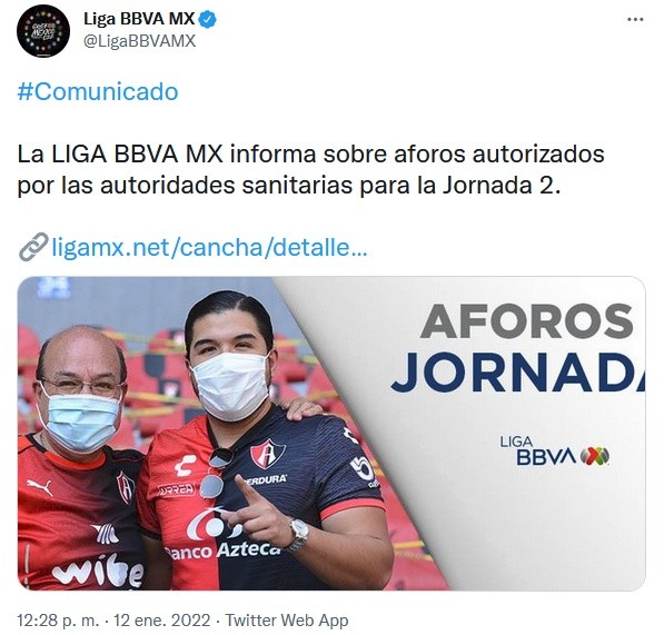 La Liga MX informó el aforo que permitirán los estadios para los partidos de la Jornada 2 (J2) del Torneo Clausura 2022, que se jugarán a partir del viernes 14 de enero. Mediante un comunicado, dio a conocer que la capacidad en los recintos depende del semáforo epidemiológico nacional, así como de la determinación de las autoridades estatales en las que tienen sede los diferentes equipos del futbol mexicano.**PospuestoEste miércoles 12 de enero se jugará el encuentro pendiente de la J1 Santos vs Tigres de la J1, y las autoridades del estado de Coahuila informaron para este se mantendrá el aforo del 80 por ciento.Reiteran el llamado a los aficionados a seguir los protocolos dentro de los recintos para disminuir los riesgos de contagio.OF