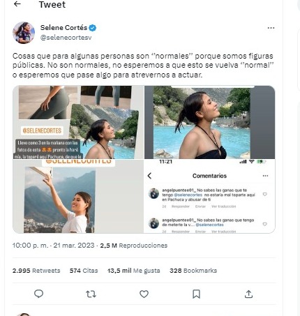 Luego del lamentable suceso que se presentó con Scarlett Camberos, jugadora del América, se ha suscitado otro caso de acoso sexual en la Liga MX Femenil, esta vez con Selene Cortés, jugadora del Club Pachuca.En esta ocasión, la futbolista del Pachuca denunció vía redes sociales que ha recibido mensajes de un usuario donde advierte que la violará en caso de encontrarla."Cosas que para algunas personas son 'normales’ porque somos figuras públicas. No son normales, no esperemos a que esto se vuelva 'normal' o esperemos que pase algo para atrevernos a actuar", escribió la jugadora del cuadro hidalguense.El usuario de Instagram angelpuente01 publicó en sus historias algunas fotos de Selene Cortés, acompañadas de mensajes como "no estaría mal toparte en Pachuca y abusar de ti".Por ahora, la Liga MX Femenil y el Club Pachuca no se han manifestado al respecto, luego de las pruebas que ha mostrado Cortés en sus redes sociales.Las Tuzas del Pachuca reciben este sábado en el Estadio Hidalgo a Tijuana; por ahora marchan en el cuarto lugar con 21 unidades, sólo debajo de Rayadas, Chivas y las Águilas del América. IO