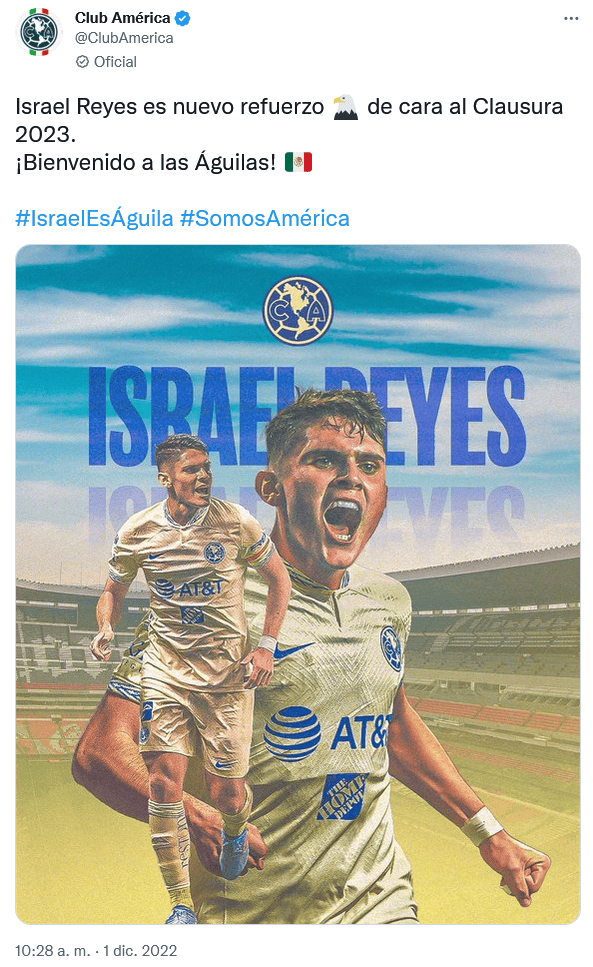 En medio de la Copa del Mundo de Qatar 2022 y un día después de la eliminación de la Selección Mexicana, el Club América hizo oficial a su primer refuerzo de cara al Clausura 2023. Después de tanta especulación al respecto, Israel Reyes llega a Coapa.El América hizo oficial la llegada del defensa central mexicano a través de una publicación en redes sociales, donde se observa a Israel Reyes portando la camiseta del América.En 20 partidos disputados la temporada pasada con el Puebla, Israel convirtió tres goles.Su llegada significa hacerse de uno de los nombres más prometedores del futbol mexicano y nuevos aires en la zaga del conjunto dirigido por Fernando Ortiz.OF