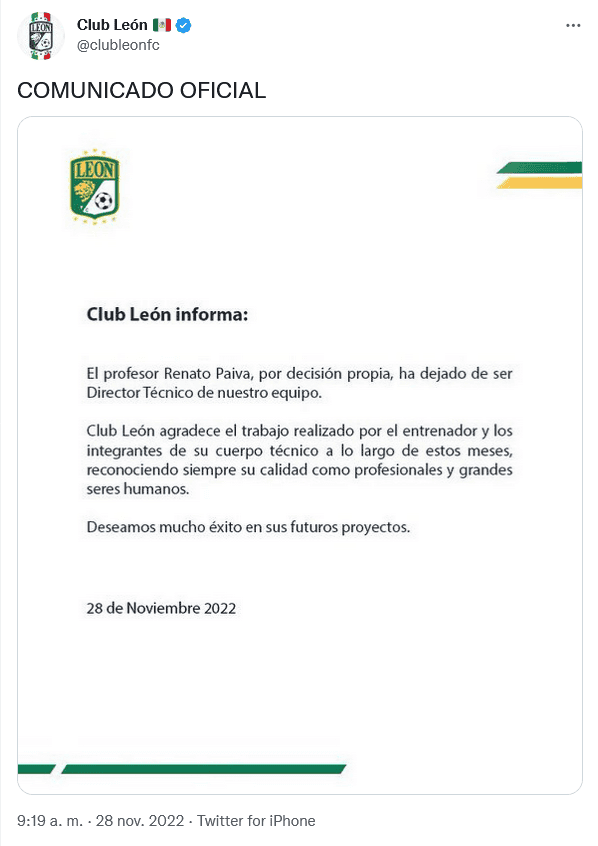 Este lunes, el equipo de la Liga MX, los Panzas Verdes de León informó por medio de un comunicado que se queda sin entrenador, luego de que el portugués Renato Paiva se fuera "por decisión propia"."El profesor Renato Paiva, por decisión propia, ha dejado de ser director técnico de nuestro equipo. Club León agradece el trabajo realizado por el entrenador y los integrantes de su cuerpo técnico a lo largo de estos meses, reconociendo siempre su calidad como profesionales y grandes seres humanos. Deseamos mucho éxito en sus futuros proyectos", publicó La Fiera en sus redes sociales.Renato Paiva estuvo al frente del León por el Torneo Apertura 2022, en el que logró llevar al equipo al repechaje.Tras haber sido eliminados de la competencia, el conjunto había ratificado al técnico para el Clausura 2023, sin embargo, este lunes confirmó que no será así, pues decidió dar un paso al costado.OF