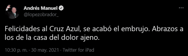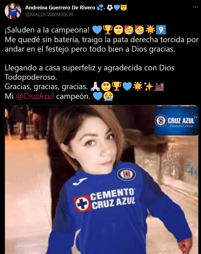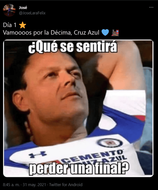 Cruz Azul hizo historia y se convirtió en campeón de México en la Liga MX, luego de derrotar a Santos Laguna (2-1) en el global, por lo que los seguidores de La Máquina celebraron en redes sociales.No obstante, los fanáticos de otros equipos también comentaron sobre el triunfo del Cruz Azul con memes tras la sequía de una victoria en la final que duró más de 23 años.“Hoy mi hijo se graduó de medicina y se puso su corbata de Cruz Azul para su evento”, “Este título también es para los que se fueron!! (La señora llevaba las cenizas al ángel)” y “Día 1. Vamooooos por la décima Cruz Azul”, son algunos comentarios de usuarios en redes sociales.Andrés Manuel López Obrador, Presidente de México, por medio de Twitter felicitó al Cruz Azul que ganó su noveno campeonato este domingo ante Santos Laguna.Otras personalidades como Sergio “Checo” Pérez y Claudia Sheinbaum también se pronunciaron a favor de “La Máquina”.Durante el juego los fantasmas aparecieron con el gol que Diego Valdés marcó para Santos al minuto 37, pero lejos de matar el alma de Cruz Azul, ese tanto levantó a una Máquina que para la parte complementaria consiguió el gol del título en los botines de Jonathan Rodríguez.En un tiro de esquina que terminó en contragolpe al 50’, el “Cabecita” llegó al área lagunera para fusilar a Carlos Acevedo, y a pesar de su pasado santista, no se limitó a la hora de cantar el gol con el que selló la novena estrella de Cruz Azul.El gol del “Cabecita” tuvo un efecto adverso en el estado anímico de los Guerreros, que perdieron el control del juego y quedaron expuestos a los contrataques celestes como al 60’ cuando el argentino Santiago Giménez voló su definición por encima del travesaño.Con su resto en los últimos minutos, el Santos buscó el gol que habría mandado la final a tiempo extra, pero Cruz Azul soportó estoico hasta el silbatazo final.Con este triunfo en la Liga MX, Cruz Azul se coronó por novena ocasión.AC