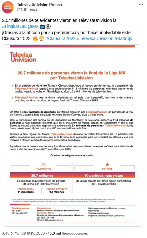 Este domingo 28 de mayo se definió al nuevo campeón de la Liga MX en el Estadio AKRON, y no sólo fueron miles de aficionados quienes asistieron al recinto para disfrutar el partido, sino millones que desde sus hogares vieron a Tigres lograr una remontada histórica sobre Chivas para bordarse la octava estrella.Televisa Univisión informó a través de un boletín que más de 20 millones de personas disfrutaron la final de ida y vuelta a través de su transmisión.De acuerdo con el informe, la ida disputada el jueves en el Estadio Universitario la vieron 11.3 millones de personas, mientras la vuelta en el Estadio AKRON la vieron 9.4 millones.Asimismo, destacó que los 10 partidos más vistos en la temporada fueron por Televisa y que fueron la única televisora en transmitir de manera gratuita las dos finales del Clausura 2023.OF