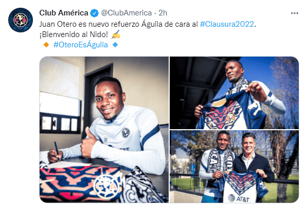 ¡Oficial! El América anunció la llegada del extremo colombiano Juan Otero para concretar a su último refuerzo extranjero que tanto estaba pidiendo el técnico argentino Santiago Solari para este Torneo Clausura 2022, del que ya se han jugado tres fechas.El equipo de Coapa anunció la contratación del jugador procedente de Santos Laguna a través de sus redes sociales y su contrato tendrá una duración por tres años, "Bienvenido Juan Otero. El Nido te espera", escribieron Las Águilas.El colombiano arribó la tarde del martes a la Ciudad de México para cerrar todos los detalles contractuales con el América y cerrar el traspaso con la directiva Lagunera. Juan Otero llegó en 2021 a la Liga MX con Santos, donde parecía que podía ser un jugador clave en el esquema de Pedro Caixinha.OF