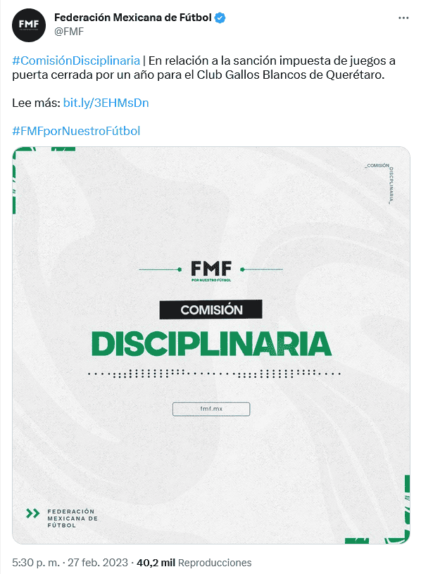 ¡Es oficial! La Comisión Disciplinaria de la Federación Mexicana de Futbol (FMF) dio a conocer que en relación con la sanción de jugar a puerta cerrada por un año para el equipo de los Gallos Blancos de Querétaro, luego de los hechos de violencia en un partido de la Liga MX ante Atlas, se determinó que el equipo volverá a recibir espectadores en La Corregidora.En un comunicado, se informó que derivado de una solicitud que realizó el propio equipo de Querétaro, se confirmó que el castigo ya se cumplió, por lo que a partir de este domingo 5 de marzo, el equipo ya podrá tener aficionado en las tribunas.Sin embargo, dice el comunicado, para llevar a cabo la reapertura, el club debe contar con una autorización emitida por la Liga MX mediante la cual se confirme el cumplimiento de todas las medidas de seguridad necesarias para llevar a cabo un partido oficial de conformidad con los Reglamentos, documentos y circulares emitidas por la FMF y la Liga MX, así como los acuerdos de asamblea correspondientes.Querétaro recibirá este domingo a Toluca, como parte de las acciones de la Jornada 10 del Torneo Clausura 2023, en punto de las 19:05 horas.El día 29 de marzo se jugará el duelo pendiente de la J4 ante Cruz Azul, el cual fue reprogramado debido a que se esperó a que se cumpliera el año de castigo y se pudiera contar con espectadores para dicho enfrentamiento.El equipo todavía tiene por jugar en casa este torneo los partidos ante Juárez (J12), Tigres (J15) y Pachuca (J17).La tarde del sábado 5 de marzo de 2022, una riña se suscitó en el Estadio La Corregidora, en medio del partido entre Querétaro y Atlas, mismo que dejó como saldo varios heridos y detenidos.La Liga MX y la FMF tomaron determinaciones tras la violencia y los rojinegros se vieron beneficiados en lo deportivo, ganando el partido 3-0, aun cuando el partido se dio por suspendido al minuto 62, en donde los Zorros ya tenían ventaja de 1-0.OF