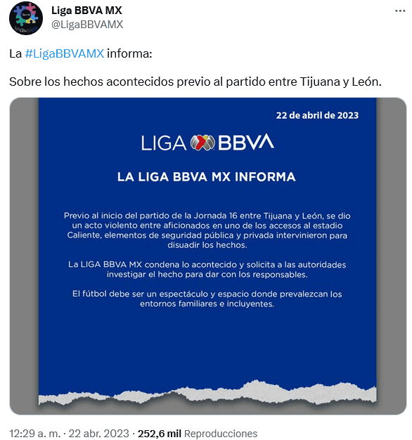 Justo en el fin de semana en donde la Liga MX ordenó de manera oficial y formal el uso del Fan ID para ingresar a todos y cada uno de los estadios del futbol mexicano para todas sus categorías principales, actos de violencia se presentaron en las inmediaciones del Estadio Caliente de Tijuana.En un video que circula en redes sociales, se puede apreciar a un fanático encapuchado de los Xolos golpear a un aficionado de León hasta dejarlo inconsciente, al lado de otros seguidores de La Fiera.Resulta curioso que Tijuana pertenezca al mismo grupo qué Querétaro, equipo causante de que la Liga haya decidido implementar medidas de seguridad especiales y en teoría estrictas, luego de los hechos violentos del pasado mes de marzo del 2022 en La Corregidora en un duelo ante Atlas.En sus cuentas oficiales, la Liga MX anuncia constantemente que el Fan ID es obligatorio para todo aquel que ingrese a los estadios, también se regodea anunciando dispositivos de seguridad en partidos de alto riesgo, sin embargo, la violencia se sigue presentando en algunos estadios del balompié mexicano, como en el Caliente de Tijuana.Tras los actos de violencia registrados ayer antes de que iniciara el partido Xolos vs León en el Estadio Caliente, la Liga MX condenó lo acontecido y solicitó a las autoridades a investigar para dar con los responsables."El futbol es un espectáculo y espacio donde prevalezcan los entornos familiares e incluyentes", dice el comunicado escueto que publicaron en sus redes sociales este sábado.OF