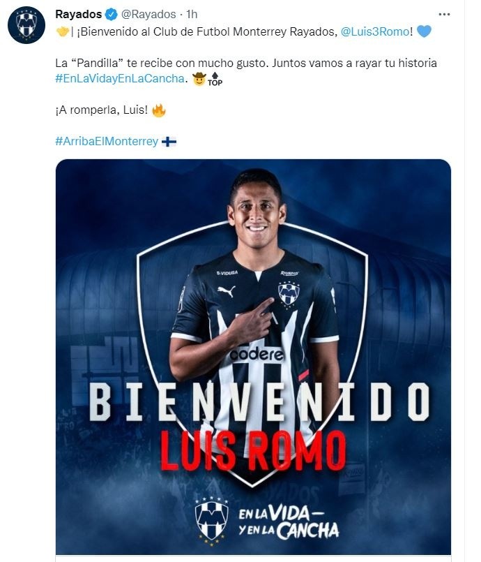 Rayados de Monterrey anunció finalmente la llega del centrocampista mexicano Luis Romo, quien se suma a Rodolfo Pizarro para el mediocampo de los dirigidos por Javier Aguirre. A través de sus redes sociales, el conjunto regiomontano le dio la bienvenida al exjugador de la Máquina del Cruz Azul. "La Pandilla te recibe con mucho gusto. Juntos vamos a rayar tu historia".Luis Romo se incorpora a la institución regiomontana tras su paso en Cruz Azul, donde consiguió el título de Liga en el Guardianes 2021 y también formó parte del plantel que se coronó en el Campeón de Campeones el mismo año.Monterrey presumió que el mediocampista logró la medalla de bronce en los Juegos Olímpicos de Tokio 2020 con la Selección Mexicana Sub-23 junto a otros elementos del club, como Érick Aguirre, César Montes y su canterano "Charly" Rodríguez, este último ya es jugador de Cruz Azul.Luis Romo no podrá debutar con su nuevo equipo en la Jornada 1 del Clausura 2022, ya que el futbolista de 26 años de edad dio positivo a Covid-19.JL