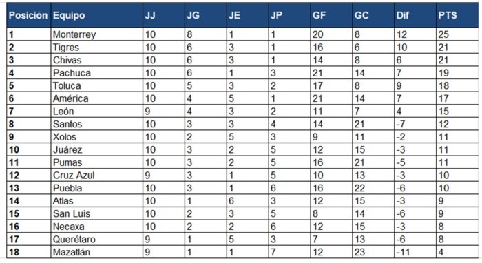 Monterrey, que goleó por 3-0 a Juárez, se confirmó como puntero del Torneo Clausura 2023 de la Liga MX, en tanto Henry Martín del América siguió como líder goleador al concluir este domingo la jornada 10.Con un gol de Rogelio Funes Mori en la victoria de Rayados, el argentino llegó su octavo para quedarse en el segundo lugar de los anotadores, una anotación menos que el mexicano Henry Martín, del América.Tigres se impuso al Necaxa en Aguascalientes, con lo que los "felinos" se acomodaron en el subliderato con mejor diferencia de goles a favor y en contra que Chivas.Dirigidas por el Profe Pauno, las Chivas se impusieron por 2-0 al Santos Laguna en la jornada sabatina.Víctor Guzmán y Fernando Beltrán marcaron por el equipo de Paunovic, que sumó su cuarta victoria consecutiva y subió al tercer lugar.El resultado más llamativo del fin de semana fue el triunfo este sábado del Pachuca, 0-3 sobre América en su propio estadio, el Azteca.La jornada empezó el viernes, cuando, además del triunfo de Tigres sobre Necaxa, el Mazatlán superó por 3-1 al Cruz Azul, con goles de Oswaldo Alanís, Roberto Meraz y el argentino Facundo Almada, y el Atlas sacó un empate 1-1 en el estadio de los Xolos de Tijuana.El sábado León le ganó 2-0 a San Luis y este domingo Puebla le pegó a los Pumas UNAM en su estadio y Querétaro derrotó por 1-0 al Toluca.El Clausura 2023 continuará con J11, del viernes al domingo próximos.NomenclaturaJJ Juegos Jugados JG Juegos Ganados JE Juegos Empatados JP Juegos Perdidos GF Goles a Favor GC Goles en Contra Dif Diferencia de Goles PTS Puntos* Participan automáticamente por el Título de Campeón de la LIGA MX en los Torneos Apertura 2021 y Clausura 2022, los doce primeros Clubes de la Tabla General de Clasificación de cada Torneo al término de las 17 Jornadas** Los Clubes clasificados en las posiciones 1, 2, 3 y 4 se ubicarán directamente en la fase de Cuartos de Final *** Los Clubes clasificados en las posiciones 5, 6, 7 y 8 jugarán en condición de local en los partidos de Reclasificación Local **** Los Clubes clasificados en las posiciones 9, 10, 11 y 12 jugarán en condición de visitante en los partidos de Reclasificación VisitanteCon información de EFEOF