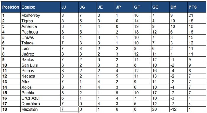 Los Rayados de Monterrey, ganadores por 2-1 sobre el Necaxa, se confirmaron como líderes del Clausura 2023 de la Liga MX, mientras que el mundialista Henry Martín, del América, lidera a los goleadores, después de ocho jornadas.El equipo que dirige Víctor Manuel Vucetich suma 21 puntos, tres más que los Tigres, ganadores por 1-0 del Atlas con un gol del argentino Nicolás Ibáñez.En un encuentro en el que ambos cuadros dejaron ir oportunidades de goles, en el tiempo de reposición de la primera mitad, Ibáñez convirtió de cabeza a pase de Javier Aquino y subió a los Tigres al segundo escaño.Ayer domingo, el América se impuso 2-1 a Tijuana y aprovechó el revés del campeón Pachuca, 1-2 ante Toluca para colocarse tercero de la tabla.Aunque se fue en blanco, Henry Martín, líder ofensivo del América, sigue como líder goleador con nueve tantos, dos más que Funes Mori.Un par de horas después de la victoria de las Águilas, el brasileño Camilo Sanvezzo anotó de cabeza en el minuto 92 y le dio al Toluca la victoria sobre los Tuzos del entrenador uruguayo Guillermo Almada.La jornada le sirvió a Chivas, del Profe Pauno para mantener su tendencia al alza al vencer por 2-1 a los Pumas en su propio estadio y saltar al quinto lugar general.Daniel Ríos y Carlos Cisneros convirtieron por el Guadalajara, que sacó provecho de los despistes defensivos de los universitarios, que descontaron con un gol del argentino Juan Ignacio Dinenno.La octava fecha empezó este viernes, cuando el Cruz Azul salió de su racha de malos resultados, al imponerse por 1-3 al Puebla, y el León empató sin goles en el estadio del Juárez FCEn otros resultados, este sábado el Santos Laguna empató 1-1 en el estadio del San Luis y este domingo el Mazatlán empató 1-1 en casa del Querétaro.El Clausura 2023 continuará de viernes a domingo próximo con la J9 de la Liga MX.NomenclaturaJJ Juegos Jugados JG Juegos Ganados JE Juegos Empatados JP Juegos Perdidos GF Goles a Favor GC Goles en Contra Dif Diferencia de Goles PTS Puntos* Participan automáticamente por el Título de Campeón de la LIGA MX en los Torneos Apertura 2021 y Clausura 2022, los doce primeros Clubes de la Tabla General de Clasificación de cada Torneo al término de las 17 Jornadas** Los Clubes clasificados en las posiciones 1, 2, 3 y 4 se ubicarán directamente en la fase de Cuartos de Final *** Los Clubes clasificados en las posiciones 5, 6, 7 y 8 jugarán en condición de local en los partidos de Reclasificación Local **** Los Clubes clasificados en las posiciones 9, 10, 11 y 12 jugarán en condición de visitante en los partidos de Reclasificación VisitanteRecuerda:Este miércoles 22 de febrero se juega el partido pendiente de la J7 entre Cruz Azul y Atlas en el Estadio Azteca.Con información de EFEOF