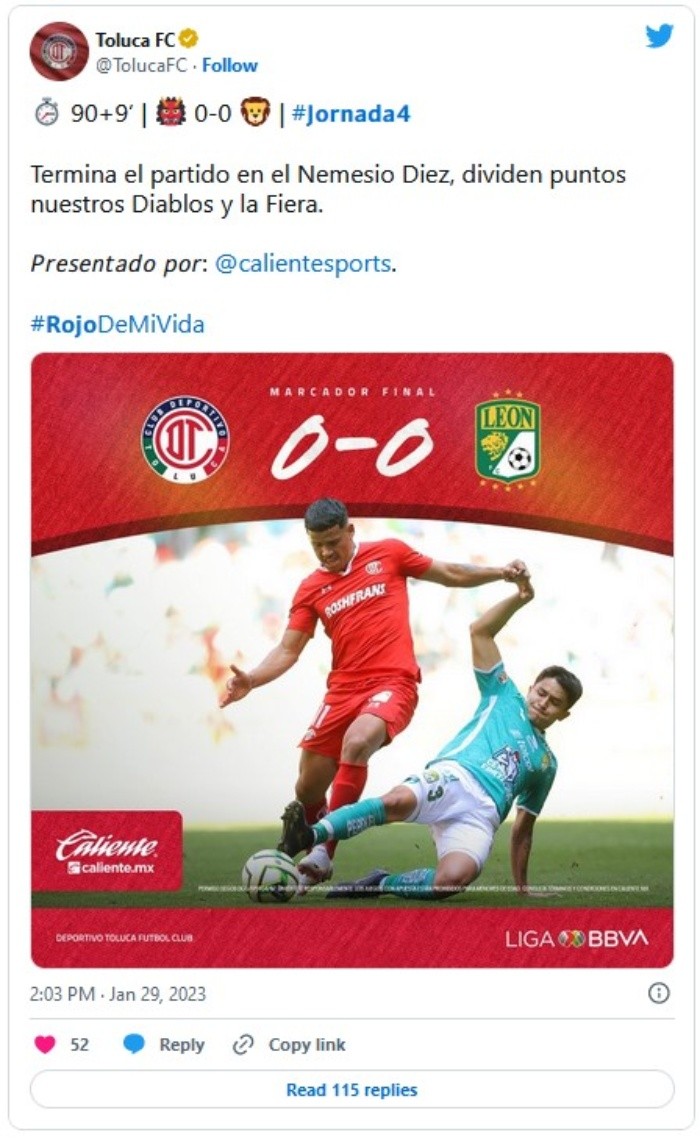 Toluca desaprovechó su localía y el jugar con dos hombres más y no pudo pasar del empate 0-0 con el León este domingo en el torneo Clausura 2023.Los Diablos Rojos dominaron el partido, pero sus atacantes no estuvieron finos para superar al portero Rodolfo Cota.León se quedó con 10 jugadores a los 37 minutos con la expulsión del argentino Lucas Di Yorio y con nueve a los 62 con la salida de Paul Bellón.Con el resultado, Toluca acumula cinco puntos. Se colocan en la novena posición, pero con un partido menos.Los Diablos Rojos no pudieron disputar su primer partido del torneo ante Atlas por las malas condiciones de la cancha del estadio Jalisco. Ese encuentro se realizará el próximo miércoles.A León el empate lo coloca con cuatro puntos, en el 12 puesto de la tabla cuando restan dos partidos por la cuarta fecha. La Fiera también tiene un partido pendiente ante Mazatlán por la primera fecha que se reprogramó para marzo.JM