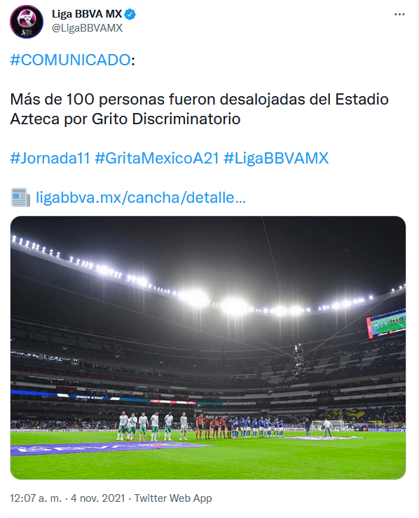 Esta mañana de jueves, la Liga MX informó que a través del comisario y el personal de seguridad y operación del Estadio Azteca, la noche del miércoles se aplicó el protocolo contra actos discriminatorios durante el partido pendiente de la J11 Cruz Azul vs León.Entre las drásticas medidas se llevó a cabo el retiro de más de 100 personas, debido a que se presentó en las tribunas el grito homofóbico en los minutos 81, 83, 88 y 90, ante los despejes del portero del León, Rodolfo Cota. El partido lo perdió La Máquina con marcador de 1-0.La Liga resalta que ante la acción discriminatoria y la reincidencia de esta, el sonido local llamó a los aficionados a evitarlo. Sin embargo se repitió, por lo que el partido se detuvo dos veces en los minutos 88 y 90.Posteriormente, el comisario de la Liga MX, apoyado por el personal de seguridad pública y privada, desalojaron del sector oriente tercer nivel del Estadio Azteca a más de 130 personas, mismas que habían realizado el grito.Fue un partido complicado para Cruz Azul, porque además de caer y poner en peligro el pase a la siguiente fase del torneo, los fantasmas de una sanción administrativa llegaron cuando se detuvo el partido dos veces y se desalojó a parte de la afición por romper las reglas.La Liga MX recuerda que está comprometida con la prevención, vigilancia y aplicación del protocolo preventivo para evitar que actos discriminatorios como el grito homofóbico sucedan en los estadios, para promover un entorno sano, familiar e incluyente.OF