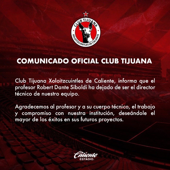 El uruguayo Robert Dante Siboldi fue cesado de la dirección técnica de los 'Xoloitzcuintles' del Tijuana el miércoles a consecuencia de las seis derrotas sufridas en lo que va del torneo Apertura-2021 del fútbol mexicano."Club Tijuana Xoloiztcuintles de Caliente informa que el profesor Robert Dante Siboldi ha dejado de ser el director técnico de nuestro equipo", dio a conocer el conjunto fronterizo en un breve comunicado de prensa.La destitución de Siboldi se da un día después de que el Tijuana fuera derrotado con marcador de 3-0 de visita en el estadio Victoria ante el Necaxa; con ese resultado, los 'Xoloitzcuintles' se quedaron con siete puntos en el decimoséptimo lugar de la clasificación con riesgo de bajar al último puesto.Desde la parte final del torneo Guard1anes Clausura-2021, el uruguayo dirigió al Tijuana en 13 partidos de liga y dejó un saldo de dos victorias, cinco empates y seis derrotas.Robert Dante Siboldi es el cuarto director técnico destituido en el actual torneo Apertura 2021 del balompié azteca después de tres mexicanos: Héctor Altamirano (Querétaro), Víctor Manuel Vucetich (Guadalajara) y Guillermo Vázquez (Necaxa).Si quieres tener más contenido, más imágenes y aún más noticias, entonces descarga INFORMAPlus, la aplicación digital de EL INFORMADOR, donde tenemos materiales exclusivos para tí.Descarga la aplicación y pruébala GRATIS por treinta días. Para iOS: https://apple.co/35jaVgbPara Android: https://bit.ly/3gwVSEVSi eres suscriptor de EL INFORMADOR tu acceso está incluido, solicítalo al 33 3678-7777JL