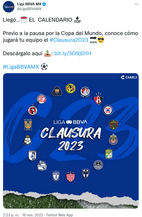 La Liga MX dio a conocer el calendario oficial de los partidos del Torneo Clausura 2023.La competencia inicia el 6 de enero, y la final del futbol mexicano se disputará el 28 de mayo.En sus redes sociales, la Liga MX informó que la fase final se jugará del 6 al 28 de mayo.La única Fecha FIFA de la temporada, luego de que se juegue el Mundial de Qatar 2022, será del 24 al 28 de marzo.Por otra parte, la Liga de Campeones de la Concacaf se disputará del 7 de marzo al 4 de junio.El primer partido del Clausura 2023 será el viernes 6 de enero, cuando Necaxa levante el telón en el Estadio Victoria ante Atlético San Luis, en punto de las 19:00 horas.Los rojinegros del Atlas debutarán el sábado 7 de enero a las 19:10 horas, cuando reciban a los Diablos Rojos del Toluca.Por su parte, Chivas visitará a Rayados de Monterrey en el cierre de la jornada sabatina en punto de las 21:10 horas.El Clásico Tapatío se programó para el sábado 1 de abril, en acciones de la J13, con los rojinegros como anfitriones en el Estadio Jalisco.Y el Clásico Nacional se jugará en la Jornada 12, cuando las Águilas del América lleguen al Estadio Akron.OF