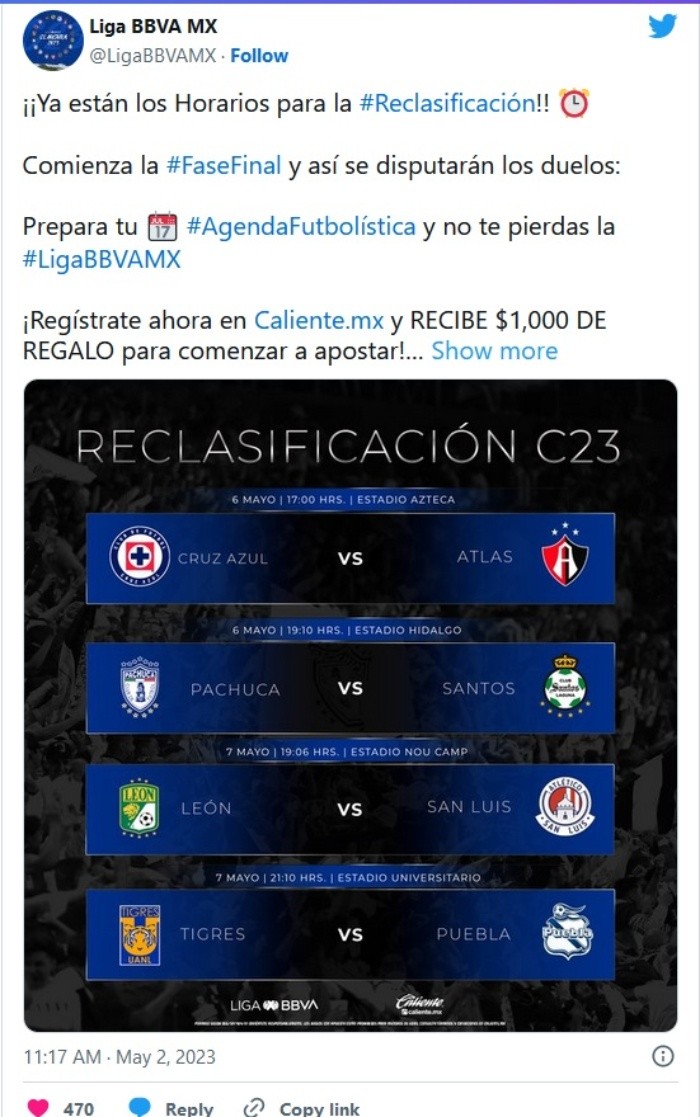La Liga MX dio a conocer oficialmente los días y horarios de los partidos de Reclasificación del Torneo Clausura 2023, en donde ocho equipos buscarán su pase a los Cuartos de Final, instancia en la cual ya hay cuatro equipos en espera.Cruz Azul, Atlas, Tigres, Puebla, León, Pachuca, San Luis y Santos Laguna buscarán su boleto entre sábado y domingo a un solo partido y en caso de que haya empate, el ganador se definirá con serie de tiros desde el manchón de los 12 pasos.El sábado 6 de mayo a las 17:00 horas, La Máquina recibirá al Atlas en el Estadio Azteca; ese mismo día, pero a las 19:10 horas en el Estadio Hidalgo, el campeón Pachuca enfrentará a los laguneros.Un día después, el domingo 7 de mayo a las 19:06 horas, León y Atlético San Luis se verán las caras en el Camp Nou de la ciudad guanajuatense, mientras que en el Estadio Universitario, Tigres le hará los honores a La Franja del Puebla a las 21:10 horas, en lo que puede lucir como el duelo más disparejo del Repechaje.Sábado 6 de mayo. 17:00 horas. Estadio AztecaSábado 6 de mayo. 19:10 horas. Estadio HidalgoDomingo 7 de mayo. 19:06 horas. Estadio LeónDomingo 7 de mayo. 21:10 horas. Estadio UniversitarioJM