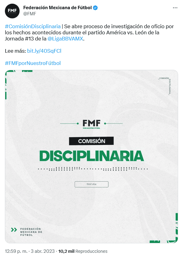 "La Comisión Disciplinaria informa que, con fundamento en lo dispuesto por el artículo 86 del Reglamento de Sanciones 2022 - 2023, inició de oficio un procedimiento de investigación por los hechos acontecidos durante el partido disputado el pasado 1 de abril de 2023, correspondiente a la Jornada 13 del Torneo Clausura 2023 de LIGA MX, entre los Clubes América y León. Lo anterior, con la finalidad de otorgarle a las partes involucradas su derecho de audiencia y la Comisión Disciplinaria disponga de todos los elementos necesarios. Una vez que esta Comisión realice el análisis de las pruebas y demás documentos aportados, emitirá la resolución correspondiente", dice el comunicado.