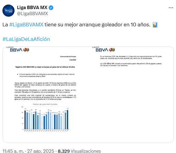 El arranque del Torneo Apertura 2025 de la Liga MX ha sido mejor de lo que se esperaba. Este miércoles, organizadores dieron a conocer que se registra el mejor inicio en cuanto a número de goles de los últimos 10 años y 20 torneos.Tras seis jornadas que se han disputado y aun con un partido pendiente por jugarse (el duelo de la Jornada 1 Chivas vs Tigres), se han anotado un total de 168 goles en 53 partidos, con un promedio de 3.16 por encuentro, el mejor en una década.La Liga MX señala que para encontrar una cifra superior de anotaciones, en el mismo número de jornadas, se tiene que remontar hasta el Apertura 2015, competencia donde se contabilizaron 172 goles en 54 partidos, con un promedio de 3.18 tantos por juego.En un comunicado, la Liga MX resalta que en el Apertura 2025 en curso, las Jornadas 2 y 3 han sido las más productivas, con 31 goles cada una, mientras que les sigue la pasada fecha 6, con 30 tantos anotados.La Liga MX volverá a la actividad a partir de este viernes 29 de agosto, cuando se dispute la J7 del certamen.*Mantente al día con las noticias, únete a nuestro canal de WhatsAppOF