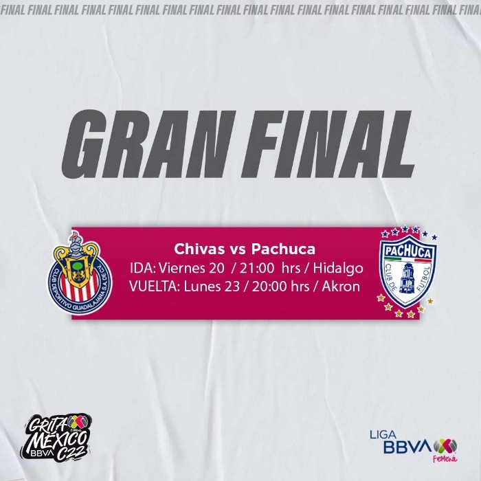 La Liga MX femenil dio a conocer este martes los días y los horarios en los que se jugará la gran final del Torneo Clausura 2022, en la que se enfrentarán Chivas vs Pachuca.El partido de Ida será este viernes 20 de mayo a las 21:00 horas en el Estadio Hidalgo.La Vuelta será el lunes 23, a las 20:00 horas, en el Estadio Akron.El equipo de Chivas Femenil logró revertir el 2-0 que consiguió en la Ida de las semifinales ante Tigres con el mismo marcador, pero avanzaron al haber concluido la fase regular del torneo en la segunda posición general.El equipo femenil del Pachuca hizo valer la ventaja que obtuvo en la Ida (2-0) y superó a las actuales campeonas Rayadas del Monterrey en el marcador global 3-2 (1-2 ayer lunes en la Vuelta).Esta será la primera Final en cinco años en donde la Liga MX Femenil no cuente con la participación de Tigres o Rayadas de Monterrey, y a su vez este duelo entre Chivas y Pachuca será una reedición de la primera Final en la historia de este circuito.OF