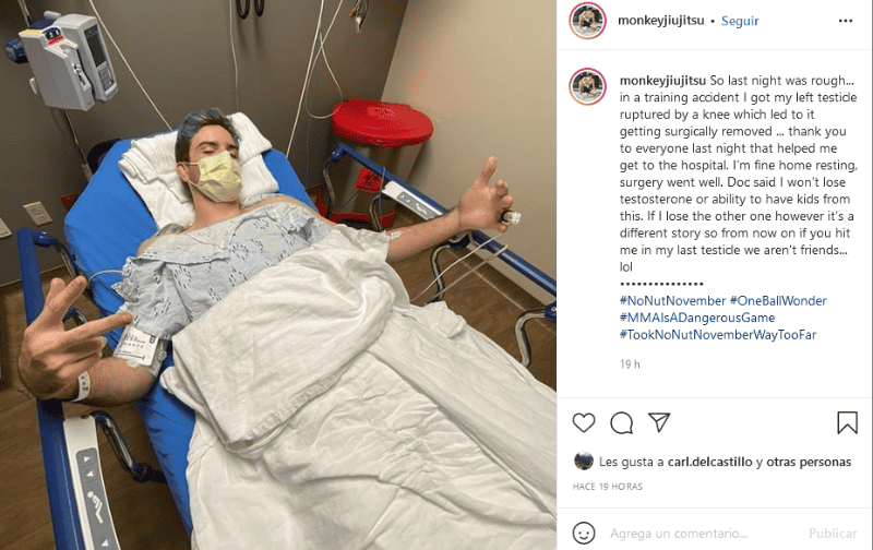El luchador de la MMA, Christian Lohsen perdió su testículo izquierdo durante un entrenamiento, según informó TMZ, que citó el anuncio publicado en sus redes sociales.La lesión se dio cuando Lohsen recibió un rodillazo en la entrepierna, razón por la que tuvo que ser intervenido de emergencia."Así que anoche fue difícil ... en un accidente de entrenamiento me rompieron el testículo izquierdo por un rodillazo que llevó a que me lo extirparan quirúrgicamente ... gracias a todos anoche que me ayudaron a llegar al hospital. Estoy bien descansando en casa, la cirugía salió bien".Y aclaró que lo sucedido no le afectará en su capacidad de producir testosterona o para tener hijos."El doctor dijo que no perderé testosterona ni la capacidad de tener hijos por esto. Si pierdo el otro (testículo), sin embargo, es una historia diferente, así que de ahora en adelante si me golpeas en mi último testículo no seremos amigos ... LOL".Christian Lohsen, de 26 años, ha ganado ocho de sus últimos 10 enfrentamientos, el más reciente por decisión unánime ante Jonas Flok el pasado 19 de agosto. Sufrió la última derrota el 23 de julio de 2019 ante JJ Okanovich en la Dana White's Contender Series: Temporada 3, Semana 5.OF