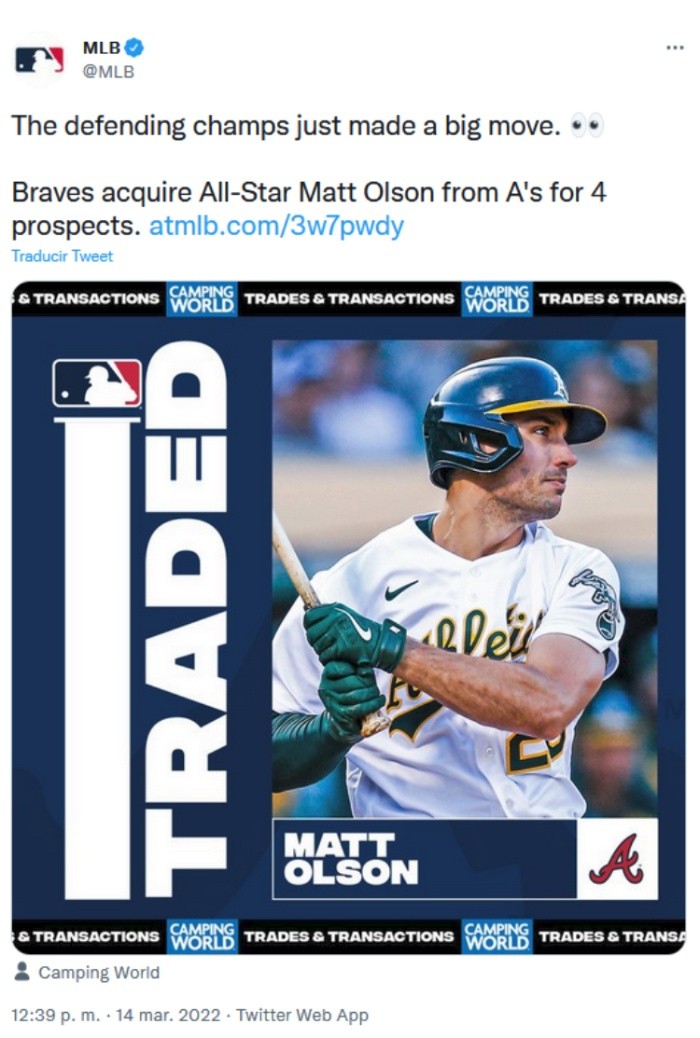 Los Atlanta Braves de las Grandes Ligas (MLB) sumaron este lunes 14 de marzo a su plantilla al primera base Matt Olson, a quien obtuvieron mediante un cambio con los Oakland Athletics.En el acuerdo por Olson, los Braves se desprendieron del jardinero dominicano Cristian Pache, el receptor Shea Langeliers y los lanzadores Ryan Cusick y Joey Estes.La llegada de Olson le brinda a los Braves un jugador de la primera base, que puede suplir el hueco que dejaría en la alineación la posible salida de su ex Jugador Más Valioso (MVP, por sus siglas en inglés), Freddie Freeman, quien es agente libre.En la pasada temporada Olson fue uno de los pilares en la ofensiva de los Athletics, al batear para promedio de .271 con 39 jonrones y 111 empujadas en 156 partidos.Los campeones defensores esperan que Olson, quien el año pasado asistió al All-Star Game, pueda mantener este tipo de producción y los ayude a defender su condición de campeones del beisbol de las Grandes Ligas.OF