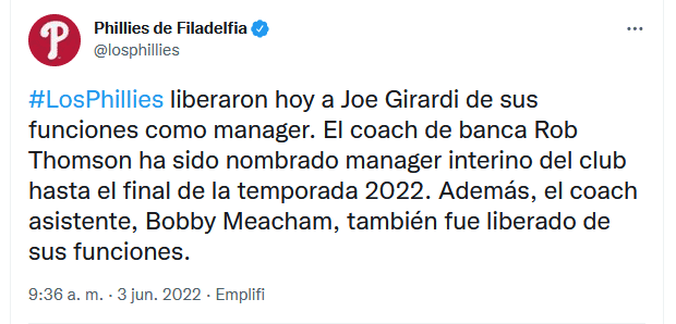 Este viernes, Joe Girardi fue despedido por los Philadelphia Phillies de después del terrible comienzo del equipo, convirtiéndose en el primer manager de Grandes Ligas en perder su puesto esta temporada de la MLB.Filadelfia anunció que el entrenador de banca Rob Thomson asumirá el papel de manager interino por el resto de la temporada.Se esperaba que los Phillies compitieran por el banderín de la División Este de la Liga Nacional, pero con marca de 22-29 se encuentran actualmente 12 juegos detrás de los líderes divisionales New York Mets."Ha sido una temporada frustrante para nosotros hasta este punto, dado que sentimos que nuestro equipo no ha jugado a la altura de sus capacidades", señaló el presidente de operaciones deportivas de los Phillies, Dave Dombrowski, en un comunicado. "Si bien todos compartimos la responsabilidad por las deficiencias, sentí que era necesario un cambio y que una nueva voz nos dará una mejor oportunidad de cambiar las cosas. Creo que tenemos un grupo talentoso que puede volver a encarrilarse, y confío en que Rob, con su experiencia y familiaridad con nuestro equipo, es el hombre adecuado para guiarnos de aquí en adelante".El primer año de Girardi con Filadelfia fue la temporada 2020 acortada por la pandemia. Los Phillies tuvieron marca de 82-80 el año pasado y el manager termina su mandato con un récord de 132-141. Girardi dirigió a los New York Yankees de 2008 a 2017 y a los Marlins de Florida en 2006.Los Phillies han perdido 12 de sus últimos 17 compromisos antes del partido del viernes, el primero de tres de la serie contra Los Angeles Angels."Tuvimos un desempeño por debajo de lo esperado y eso recae en mí. Esto es lo que sucede", dijo Girardi a MLB Network Radio de SiriusXM. "Creo que tenemos más talento del que hemos mostrado".Los Phillies tienen una nómina de 224 millones de dólares y cuentan con el Jugador Más Valioso de la Liga Nacional en 2021, Bryce Harper, y con Zack Wheeler -segundo lugar en la votación por el Cy Young de la Liga Nacional- Aaron Nola, el receptor All-Star J.T. Realmuto y los toleteros agentes libres Nick Castellanos y Kyle Schwarber. Sin embargo, Filadelfia no ha avanzado a los playoffs desde 2011, no ha ganado una Serie Mundial desde 2008 y ha visto cómo el interés de los fanáticos se ha ido desplomando durante más de una década de un beisbol mediocre.Los Phillies se vieron afectados por un declive de su bullpen, deficiencias defensivas y comienzos lentos de algunos de sus veteranos de alto salario (Schwarber batea para .192).La directiva de Filadelfia también despidió al asistente de entrenador Bobby Meacham y ascendieron a Mike Calitri al rol de entrenador de banca.Thomson era el entrenador de banca de Filadelfia y coordinó los entrenamientos de primavera durante las últimas cinco temporadas. Fue contratado antes de la campaña 2018."Estoy listo para liderar este equipo y espero comenzar a trabajar y cambiar esta situación", subrayó Thomson.Su primer reto es contra unos Angels que ha perdido ocho juegos consecutivos en general y seis seguidos como visitantes.OF
