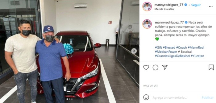 El pitcher mexicano de los Chicago Cubs, Manuel Rodríguez, debutó el pasado mes de julio en las Grandes Ligas de beisbol (MLB) y se volvió viral el día de ayer debido al espectacular regalo que dio a su padre, como agradecimiento por llegar a donde está.Según cuenta Manny Rodríguez, su papá trabajaba como taxista para ayudarlo, ya que desde niño tenía el sueño de jugar beisbol y llegar a la MLB, cosa que finalmente sí sucedió. Así que decidió recompensarlo con un automóvil nuevo.El beisbolista compartió en su cuenta de Instagram unas fotografías donde se les ve a ambos posando junto al coche, acompañadas estas por un emotivo mensaje.Tras haber sido llamado de Triple A, el mexicano Manuel Rodríguez debutó en las Grandes Ligas con Chicago Cubs ante Washington Nationals. Esa noche se convirtió en el primer jugador en la historia originario de Yucatán en jugar en la MLB.A una semana de cumplir 25 años, apareció en la octava entrada en el juego ante Nats, retiró a los tres bateadores a los que enfrentó, aunque finalmente su equipo cayó 4-3.Fue el segundo jugador mexicano en debutar en la temporada 2021, después de que viera acción por primera vez Alejo Lopez el 28 de junio con los Cincinnati Reds.OF