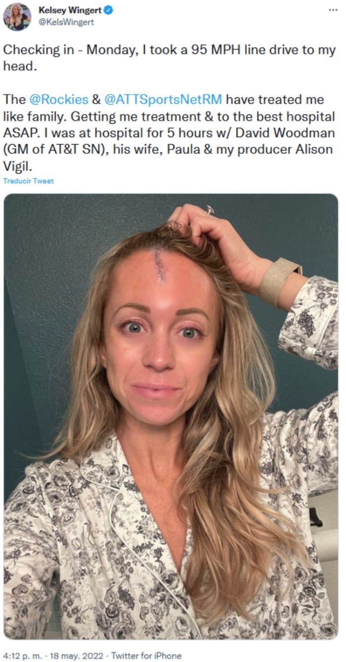 Hace unos días, la reportera Kelsey Wingert sufrió un fuerte pelotazo en la frente durante un partido de las Grandes Ligas de Beisbol (MLB) entre San Francisco Giants y Colorado Rockies, y de inmediato circularon videos en Internet del momento en el que fue sacada del estadio para ser atendida.Después, la propia periodista utilizó sus redes sociales para mostrar en una fotografía la cicatriz que le quedó al recibir puntos de sutura en la herida que sufrió."Los @Rockies y @ATTSportsNetRM me han tratado como familia. Me consiguieron tratamiento y el mejor hospital lo antes posible", escribió.Kelsey Wingert se encontraba cerca del dugout cuando el bateador de Giants, Austin Slater, dio un batazo de foul en el que la pelota, que salió a una velocidad de 153 kilómetros por hora, terminó impactando en su rostro.Después, en las imágenes de la televisión se pudo ver cuando Wingert salía caminando, acompañada de varias personas, con sangre que surgía de su frente."Estuve en el hospital durante cinco horas con David Woddman, su esposa Paula y mi productora Alison Vigil", dijo la reportera en su mensaje en Twitter.OF