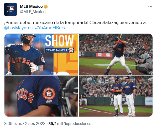 El beisbol en México sumó este domingo a un nuevo representante en las Grandes Ligas (MLB, por sus siglas en inglés), con el debut del pelotero César Salazar, quien ingresó al terreno de juego en el duelo entre Houston Astros y Chicago White Sox.El mexicano, quien destacó en el Spring Training al batear .286 con seis imparables y siete carreras impulsadas entró como bateador emergente y recibió la base por bolas.Un momento que fue compartido con orgullo por parte de la cuenta de MLB en México y que de inmediato recibió todo tipo de comentarios deportivos.El originario de Hermosillo, Sonora, tuvo antes de su debut en la MLB un recorrido destacado por las sucursales de los Astros, a las que llegó en 2018 y ha jugado 265 encuentros, producido 148 carreras y conectado 43 homeruns.Su paso por México se dio en la temporada 2022-2023, al participar con los Naranjeros de Hermosillo en la Liga ARCO Mexicana del Pacífico, logrando un porcentaje de bateo de .232.OF